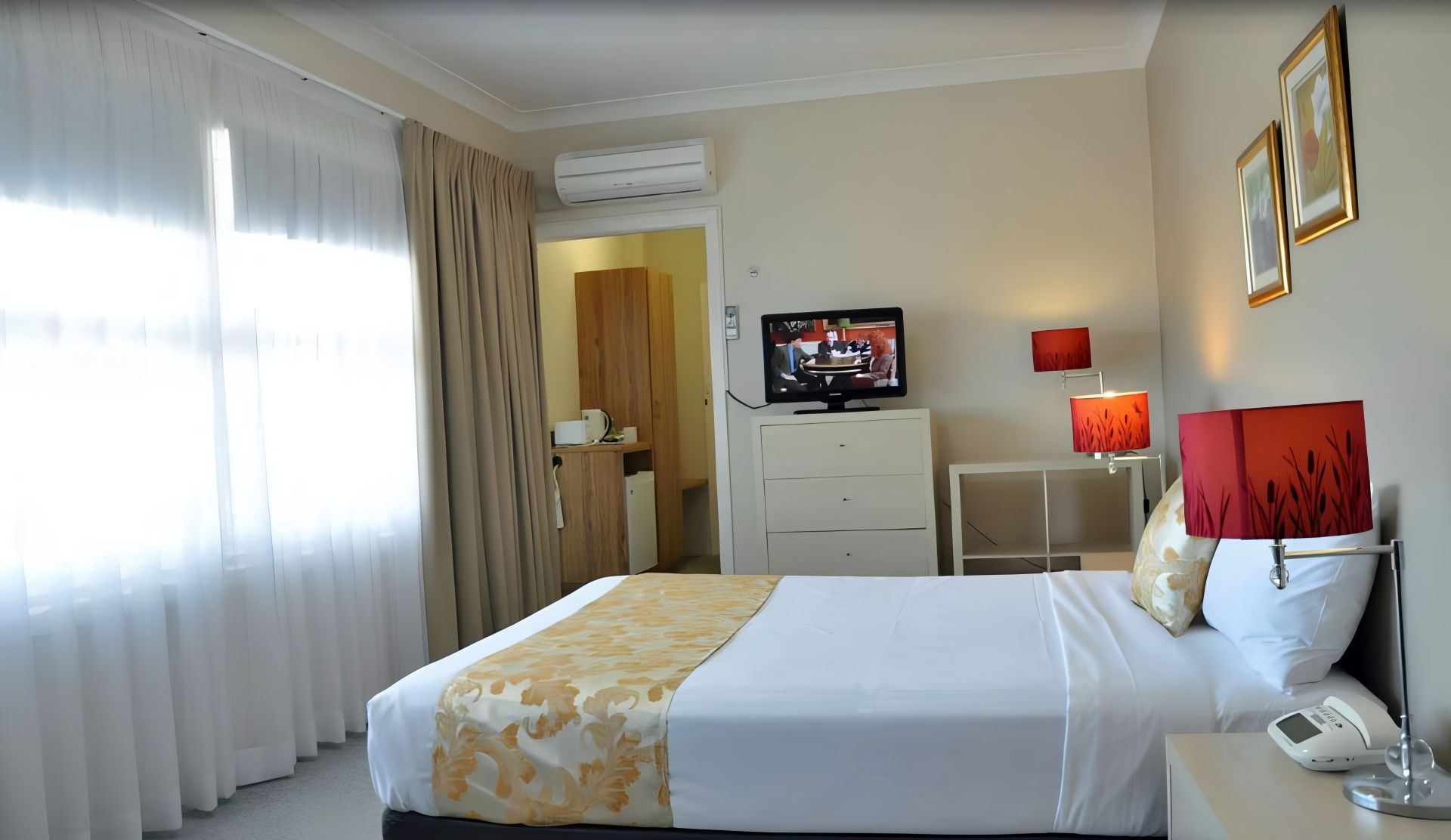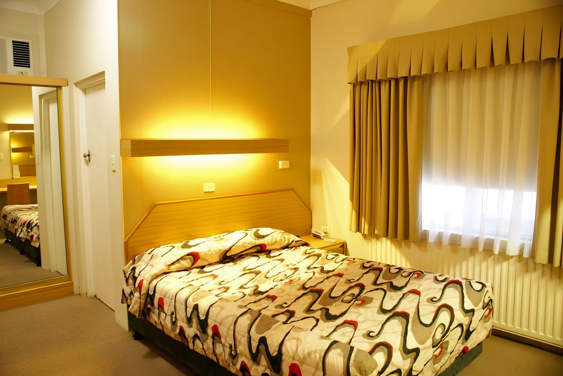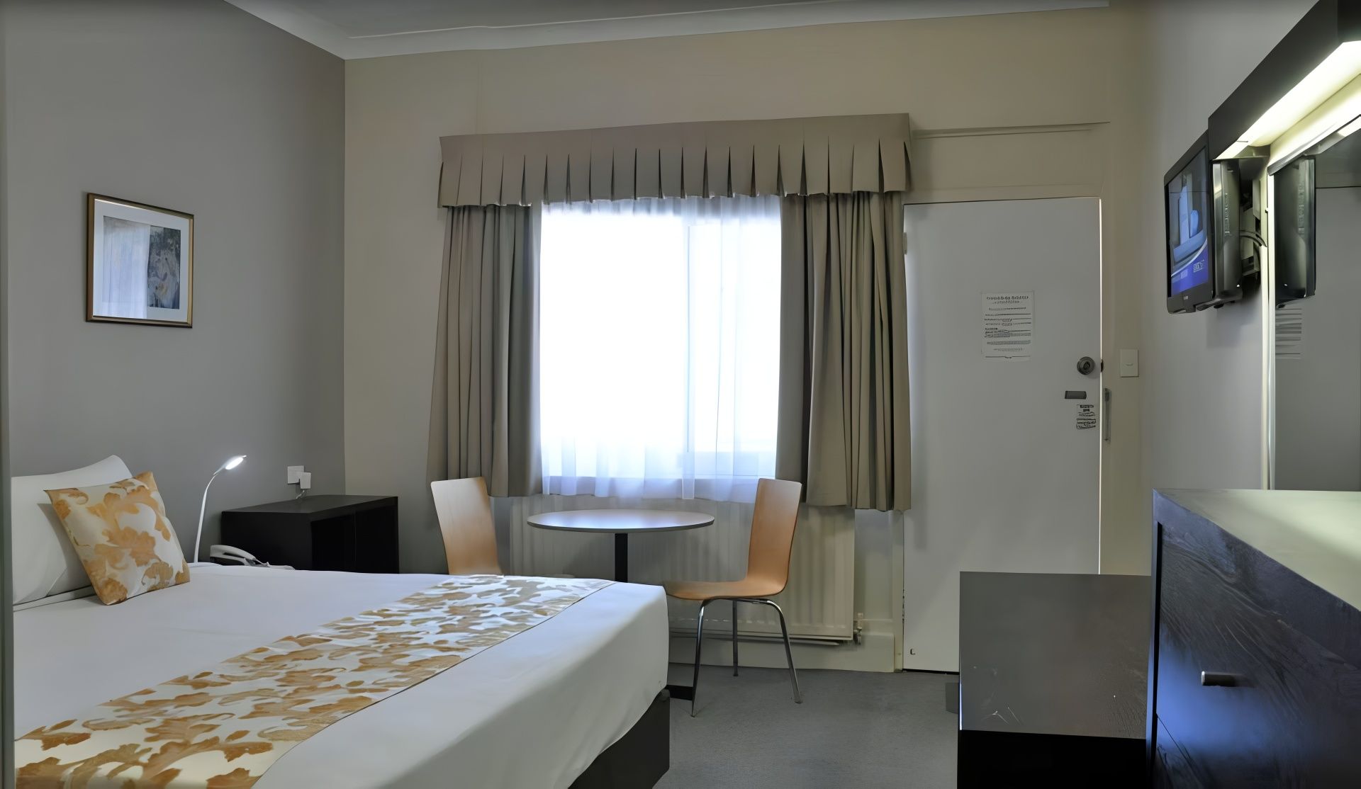 For 1 to 2 persons, non-smoking ground floor renovated room with luxury pillow top King bed, desk, small dining table, flat screen LCD TV, reverse cycle air conditioner. Next door to Panther league club, cinema, restaurants, museum, race track, CBD.