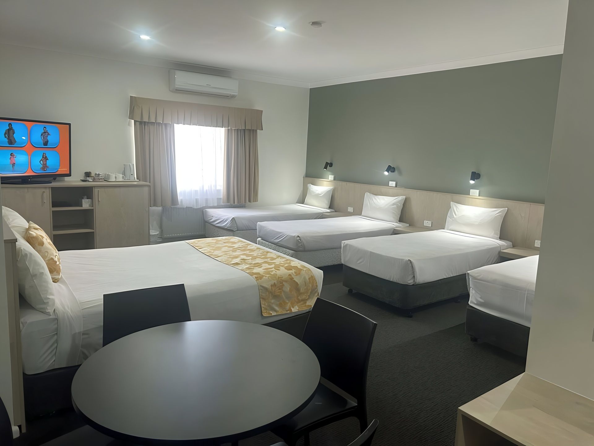 Sleep up to 4 persons, non-smoking room with one queen and two single beds, free WiFi, tea & coffee making facility, flat screen LCD TV, reverse cycle air conditioner, small dining table, onsite parking. This room is upstairs.